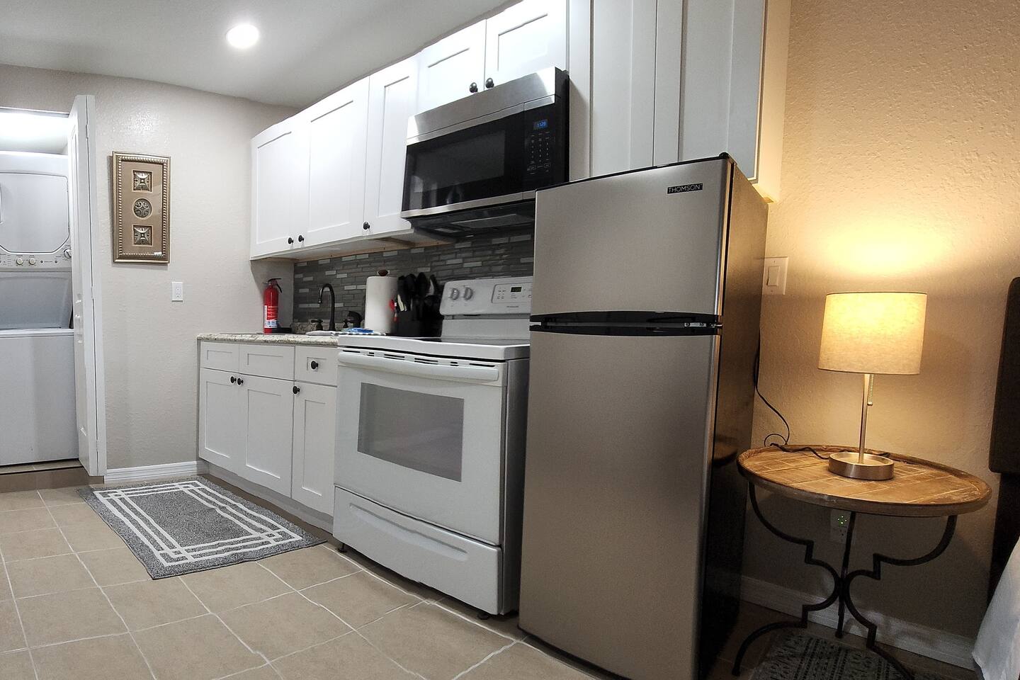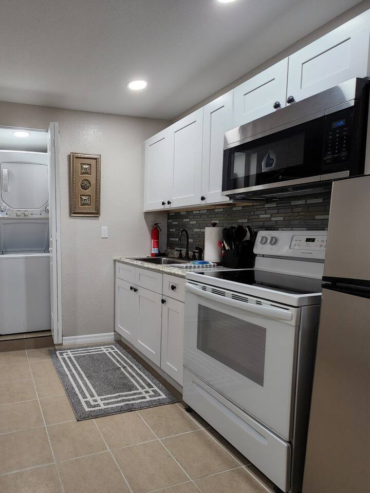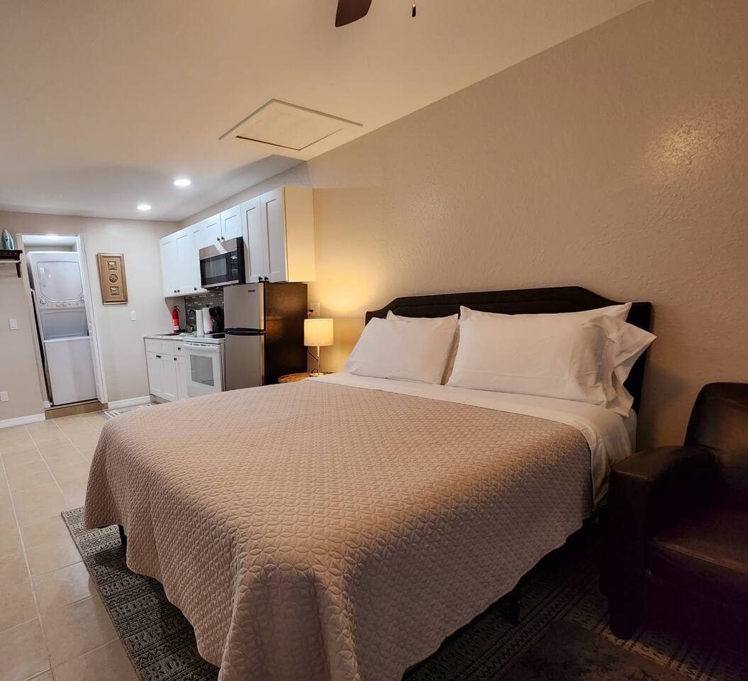 Studio Home has everything you need for a short or long stay. kitchenette with various cooking accesories and amenities, beautiful modern shower /bathroom, queen size bed nice bedside table with lamp. Washer and dryer, wifi, tv, dining table etc. Self check in, and you share NON of these ! Free parking and a wonderful patio with comfortable nice chairs to relax in a quiet enviroment, yet close enough to all downtown activities. Discounts available for weekly or longer stay!